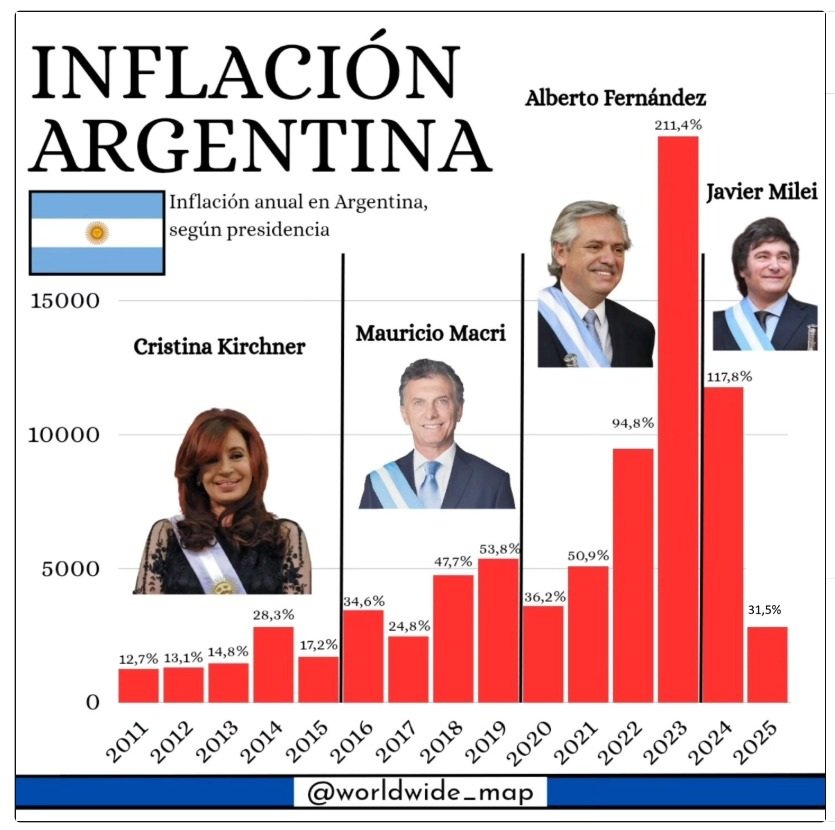 Estos grupos, al declararse enemigos de USA y Europa por motivos ideológicos, establecieron relaciones amistosas con países del mapa geopolítico que no acceden al crédito, que no crecen, que tienen sistemas políticos autoritarios o directamente tiranías: me refiero a Venezuela, Ecuador, Bolivia, Irán, Rusia, etc. Fue entonces que, al no poder obtener forma alguna de financiamiento, echaron mano a la emisión monetaria de forma descontrolada. Basta ver el gráfico de la portada para saber lo que fue el último gobierno. Si en el mundo la inflación anual ronda el 5%, en la Argentina de los Fernández y Massa, llegó a ser 211% solamente en el 2023.